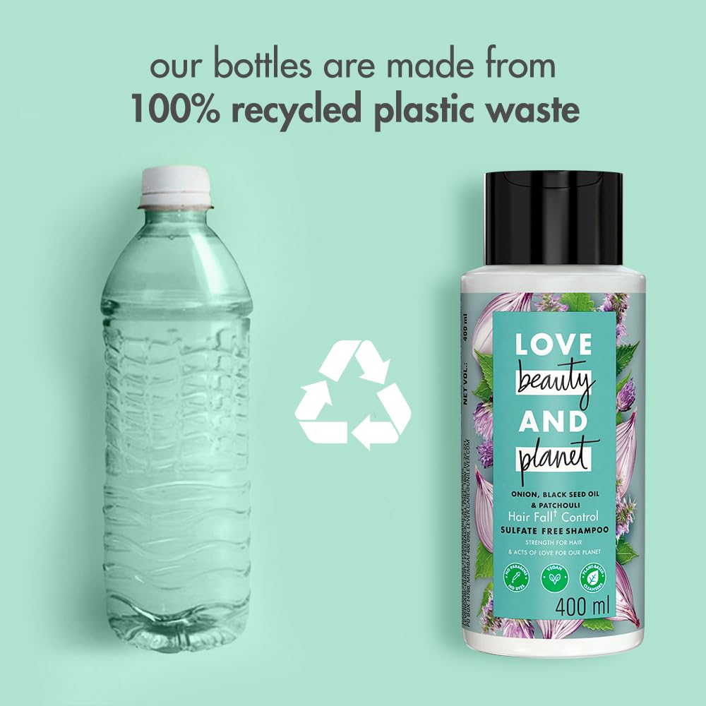 Say bye-bye to hair fall worries and hello to strong strands! This shampoo|| infused with Onion and Black Seed oil|| helps to strengthen hair and nourish scalp for healthy looking tresses. Breathe in the gorgeousness of your freshly washed hair with the sweet|| oh-so-sumptuous scent of ethically sourced Patchouli Oil. This shampoo contains natural ingredients and Plant-Based Cleansers. All our shampoos and conditioners are safe for colored hair. Our goal is a carbon footprint so small|| it’s like we weren’t even here. We|| at Love Beauty & Planet have started our journey by loading our products with natural goodness and packing it in bottles made from 100% recycled plastic. Our delicate scents are infused with natural and ethically sourced oils and extracts. All our bottles are made up of 100% recycled plastic waste and are completely recyclable. Our caps and pumps aren’t made from recycled plastics yet|| but we’re working on it. Our products are free from added harsh chemicals like parabens|| dyes|| phthalates and sulfate cleansers. Love Beauty & Planet is PETA Certified cruelty-free and vegan. Globally|| Love Beauty & Planet does not test on animals. We are committed to acts of love that make our planet cleaner|| greener and more beautiful.*OLD